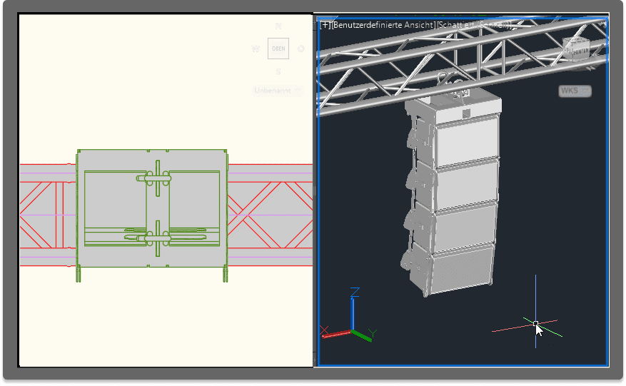Eine Vielzahl von AutoSTAGE Audio Symbolen speichern eine 2D- und eine 3D-Ansicht. Wird die Zeichnung in der Draufsicht betrachtet, wird ein 2D-Symbol angezeigt. Bei allen anderen Ansichten, z. B. in der Isometrie, wird ein 3D-Symbol angezeigt.