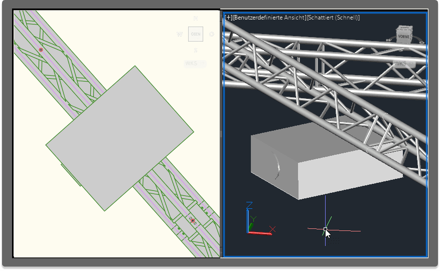 Eine Vielzahl von AutoSTAGE Video Symbolen speichern eine 2D- und eine 3D-Ansicht. Wird die Zeichnung in der Draufsicht betrachtet, wird ein 2D-Symbol angezeigt. Bei allen anderen Ansichten, z. B. in der Isometrie, wird ein 3D-Symbol angezeigt.